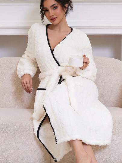 1 件女士优雅奢华 V 领长袖长袍,带腰带和口袋,秋冬家居浴袍 - 白色 - 查看 1