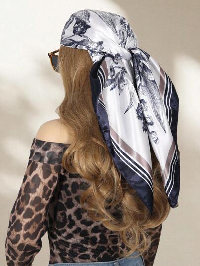 1 件女士海军蓝蝴蝶和花朵印花缎面方形围巾,时尚户外头带,情人节礼物头巾 - 藏蓝色 - 查看 1