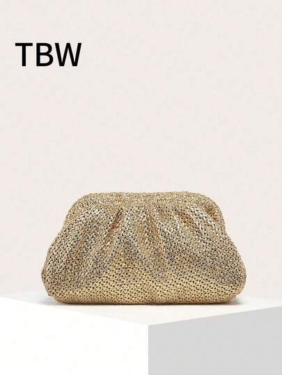 女士纯色草编皱云包,复古大容量时尚,适合外出逛街。 - 金色 - 查看 1