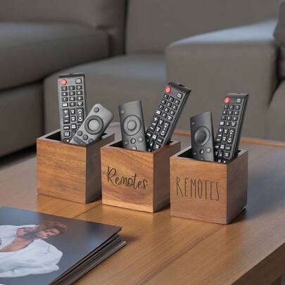 1个木质遥控器收纳盒,电视遥控器整理器,桌面遥控器收纳架,床头柜遥控器收纳盒,客厅卧室媒体存储木质遥控器盒 - 棕色 - 查看 6