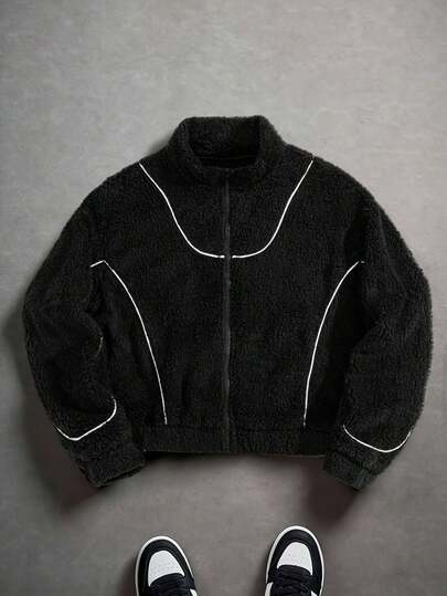 1 件 Y2K 撞色街头风格羊毛夹克,适合青少年男孩,美式短款简约设计,温暖舒适,适合通勤、休闲外出,可作为前开衫穿着 - 黑色 - 查看 1