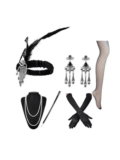 1套/5件1920年代女士復古黑色羽毛頭帶珍珠項鍊多層珍珠手鍊復古流蘇耳環手套支架配羽毛蛇紋圍巾萬聖節裝扮用品