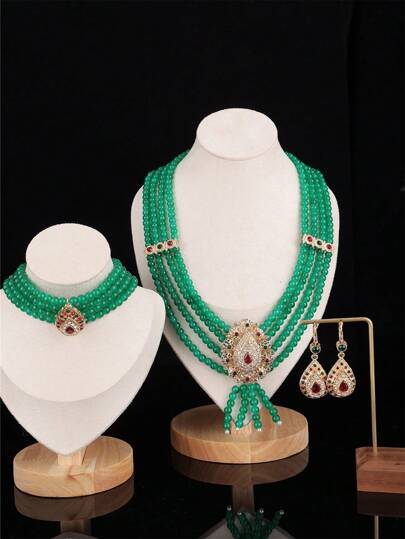 1 套經典新娘婚禮珠寶套裝,包括珠子項鍊、水滴耳環和手鍊,水滴風格 - 綠色 - 查看 1