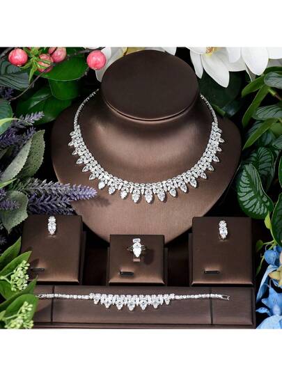 1套皇家風格立體花瓣水滴鑽楓葉流蘇珠寶套裝,適合女性情人節禮物 - 銀色 - 查看 1