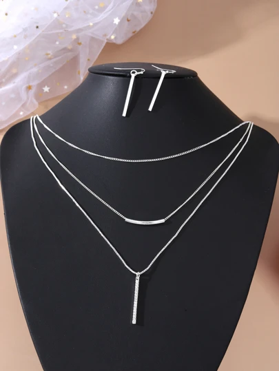 1件套簡約風銀色調合金長款吊墜項鍊和耳環適用於女士日常風格 - 銀色 - 查看 1
