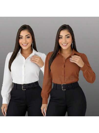 2-Piece Set Of Women's Fashionable Dress Shirts With Buttons