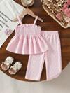 BABY GIRL 纹理粉色条纹短款上衣和闪亮褶皱阔腿裤套装,休闲夏季服装