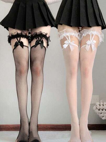 2 双蕾丝上衣渔网袜蝴蝶结吊带大腿袜网眼吊袜带女士长筒袜 - 彩色 - 查看 1