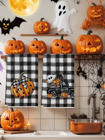 2 件万圣节复古南瓜鬼浴室手巾蜘蛛网蝙蝠女巫帽黑猫农舍餐厅装饰厨房毛巾 - 黑色 - 查看 1