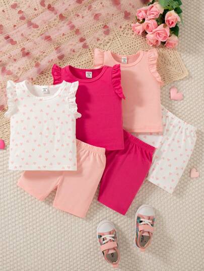 SHEIN 女婴心形印花圆领盖袖 T 恤和短裤两件套,舒适休闲套装,夏季 - 彩色 - 查看 6