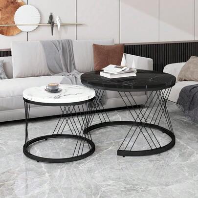 2-Piece Nesting Coffee Tables, Round Marble Pattern Top With Gold Frame, Space Saving Side Table Set For Living Room & Bedroom, White & Black - 白色+黑色 - 查看 10