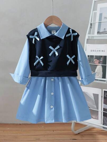 两件套年轻女孩时尚立领衬衫配领带蝴蝶结背心,休闲校园风格服装,适合春秋季节 - 寶藍色 - 查看 2