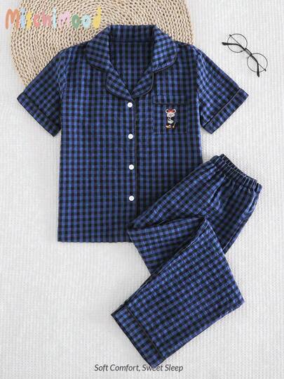 两件套女童卡通刺绣梭织运动服:开衫上衣和裤子,优质面料,海军蓝,睡衣/家居服 - 淺藍色 - 查看 1