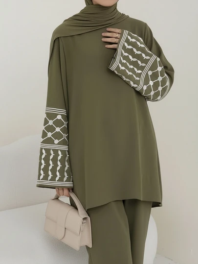 女士两件套宽松套装,2026春夏款,几何刺绣图案袖口设计 | 中东优雅两件套,时尚斋月长袍套装,优雅阿拉伯服饰 - 軍綠色 - 查看 2