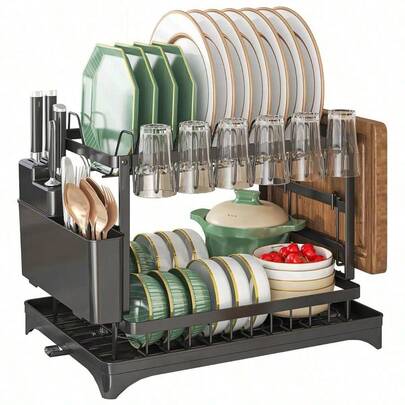 2 Tier Dish Drainer Rack For Kitchen Counter - Space-Saving Dish Rack With Utensil Holder And Cutting Board Holder Large Capacity Drying Rack With Draining Board, Black - 黑色 - 查看 1