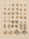 30 对套装优雅简约金属仿珍珠小花全水钻心形和蝴蝶结女士派对奢华耳钉情人节礼物