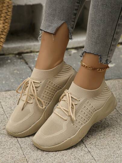 2023秋天新款大尺寸女性舒服的透氣針織運動鞋低胸平底休閒鞋 - 卡其色 - 查看 2