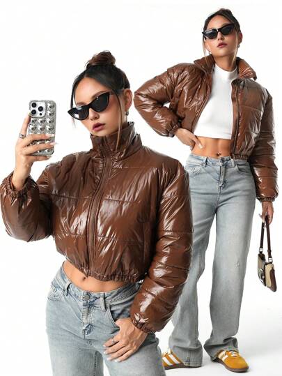 SHEIN 2024 秋冬青少年女孩优雅天鹅绒领子棉服外套 - 黑色 - 查看 1