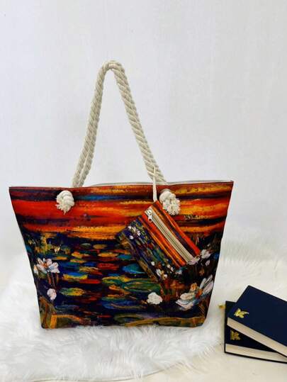 2024新款夏季度假帆布女托特包大容量时尚印花单肩手提包 - 莫內1 - 查看 1