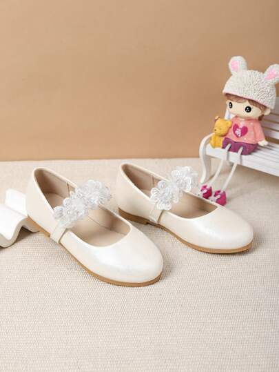 2025时尚珍珠莲花儿童平底鞋防滑耐磨舒适女童鞋校园演出适合婚礼花童穿可爱漂亮女童平底鞋青少年鞋 - 白色 - 查看 1