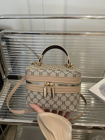 2025 时尚休闲大容量新款纹理印花盒子链条手提包、单肩包和斜挎包 - 卡其色 - 查看 2