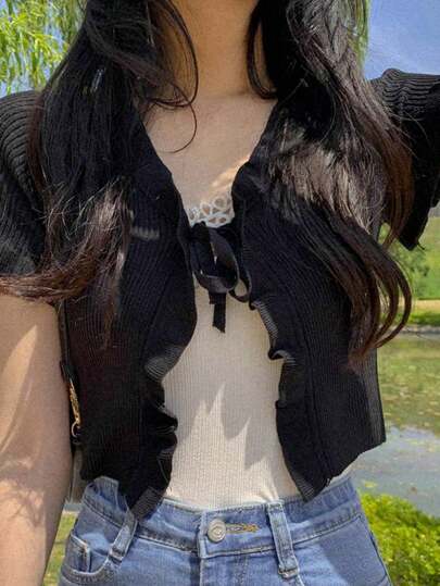 2025春夏Gyaru时尚休闲纯色系带短款开衫 - 黑色 - 查看 1