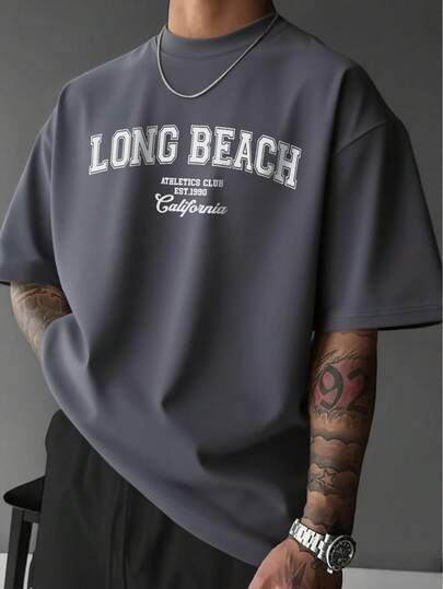 2025 男士夏季字母印花圆领短袖休闲T恤 - 深灰色 - 查看 1