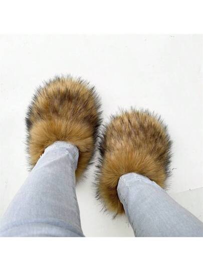 2025新款欧美风格女士仿皮毛拖鞋,蓬松毛绒毛绒衬里室内家居拖鞋,秋冬适用 - 棕色 - 查看 10