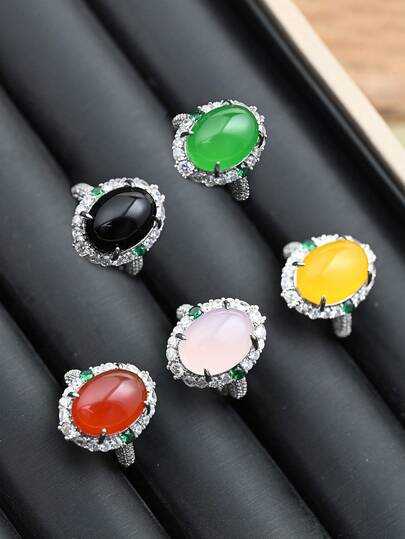 2025 新款天然玛瑙玉戒指,半透明玉髓镶嵌戒指,女士婚礼订婚珠宝戒指,学生和最好的朋友可调节 INS 风格戒指,礼物,经典凸圆形闪亮方晶锆石玫瑰金水晶戒指 - 戒指 - 查看 1