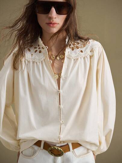 Ontre 2025新款女装镂空刺绣拼布纽扣灯笼袖宽松休闲办公室优雅教师节衬衫,适合秋冬 - 杏色 - 查看 1