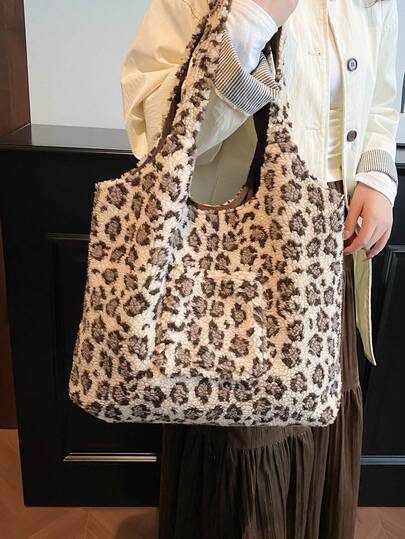 2025秋冬新款毛绒皮草包,百搭豹纹大容量手提包,时尚单肩包,女士通勤包 - 米色 - 查看 6