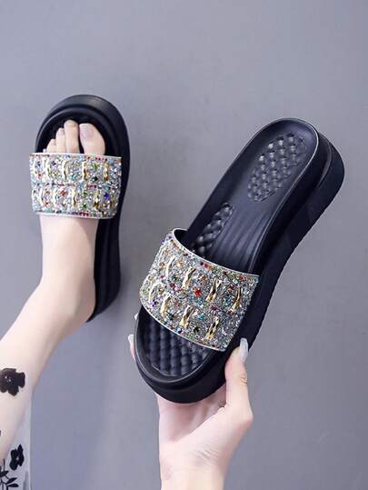 2025 年夏季新款时尚水钻装饰厚底拖鞋,女士时尚沙滩凉鞋 - 銀色 - 查看 1