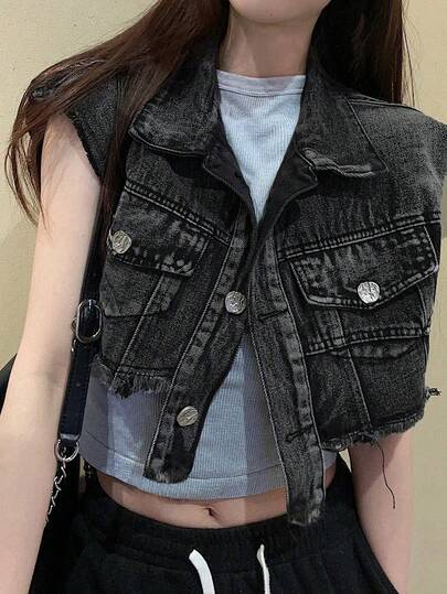 2025 夏季女式复古时尚磨边牛仔背心,小码短款背心 - 黑色 - 查看 1