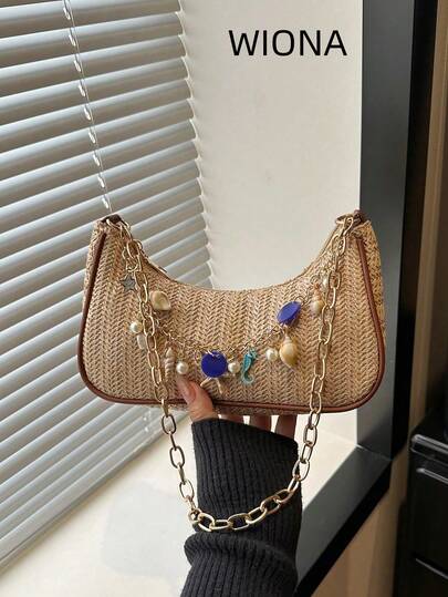 2026新款时尚夏季草编单肩腋下包,带链条