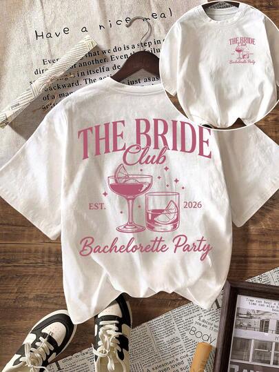 2026新款复古风女士休闲夏季上衣,双面印花,一面是星星图案,另一面是“THE BRIDE Club EST”单面印花,圆领,纯色短袖T恤 白色