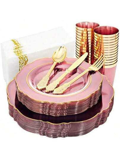 210Pcs Clear Pink Plastic Plates With Gold Rim& Disposable Gold Plastic Silverware &Pink Cups&Hand Napkin- Plum Colored Plastic Dinnerware For Upscale Wedding &Easter&Mothers Day - 粉色 - 查看 1