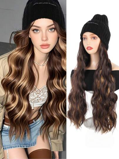 22 英寸波浪针织假发帽合成纤维假发,长染女士假发帽,适合日常秋冬装,时尚百搭 - 彩色 - 查看 1