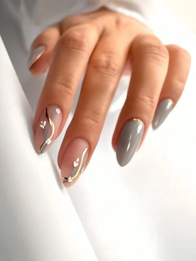 24枚中號杏仁灰色假指甲,花卉設計閃耀光澤貼式假指甲,含指甲膠,適用於女性和女孩 - 彩色 - 查看 1