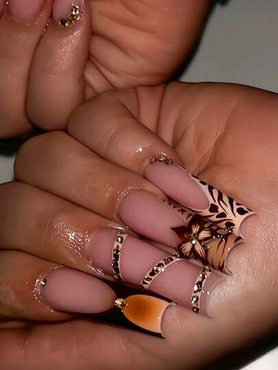 24 片长方形按压指甲,欧美法式豹纹浮雕花朵夏季美甲用品,Y2K 辣妹风格,全覆盖易粘贴设计,适合女士和女孩旅行、度假、聚会 - 彩色 - 查看 1