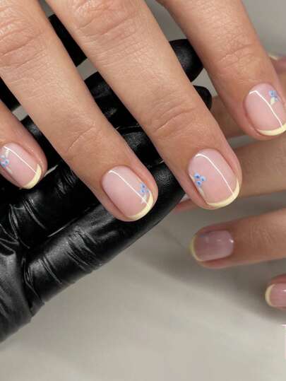 24 件法式黄色按压式指甲简约清新设计花朵假指甲短椭圆形假指甲美甲套装包含 1 片粘合片和 1 个迷你指甲锉,非常适合日常佩戴美甲用品
