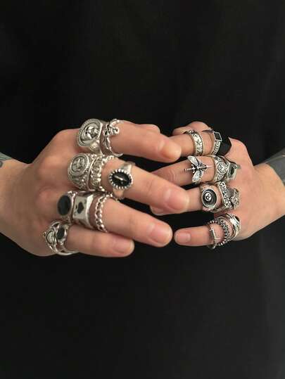 24 件哥特式骷髅吊饰戒指套装,时尚街头嘻哈男士珠宝 - 復古銀色 - 查看 6