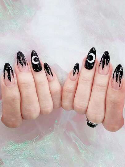 用24入組長杏仁黑火月圖案假指甲和1入組指甲銼和1張膠帶升級您造型 - 彩色 - 查看 5