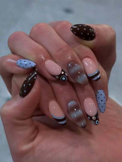 24片长杏仁形条纹波点图案美甲贴纸,按压式假指甲,完美贴合,套装包含:1片果冻胶和1把指甲锉。夏季美甲,适合女性和女孩日常工作和派对使用。