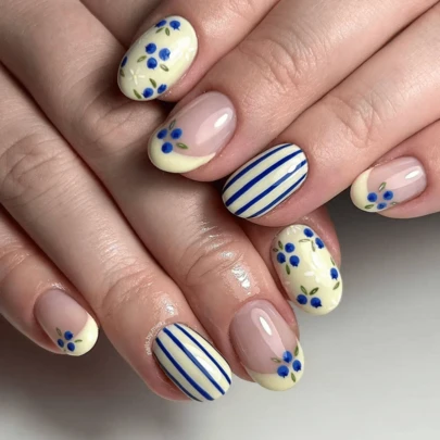 24片椭圆形美甲贴纸,包含蓝黄法式美甲、蓝莓黄水果、条纹图案等,适合女性和女孩,春、夏、秋、冬四季皆宜,是派对、约会和日常办公佩戴的理想选择。
