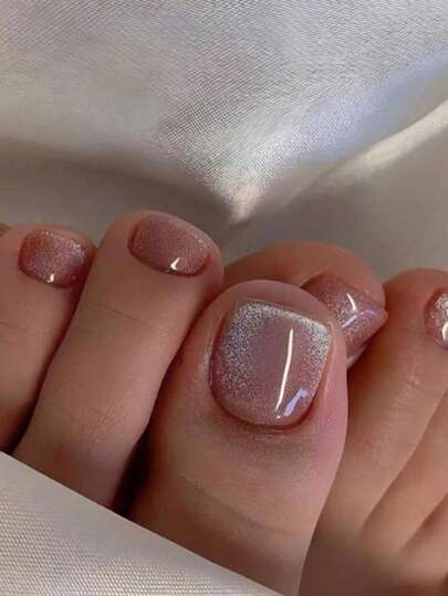 24 件短方形裸色水晶猫眼美甲套装,全覆盖脚趾甲贴纸套件,适合女士和女孩的指甲 - 粉色 - 查看 1
