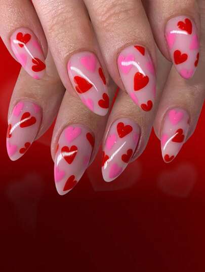 24片情人节粉色爱心 - 红色法式杏仁形亮面酒红色假指甲套装,中等长度,适合情人节和特殊场合美甲用品 - 紅色 - 查看 1