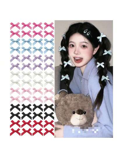 28/100件装女士发饰:7款彩色丝带蝴蝶结发夹/流行款/甜美少女丝绸小发夹/优雅公主仿毛皮发夹/芭蕾舞风Y2K仙女配饰/适合日常佩戴/可爱迷你缎面发夹 - 彩色 - 查看 11
