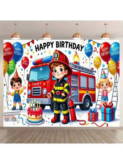 2D 单件消防员生日派对背景 - 卡通消防员、消防车和消防员主题派对装饰、2D 平面涤纶旗帜、室内/室外使用多种尺寸、消防员礼物 - 彩色 - 查看 2