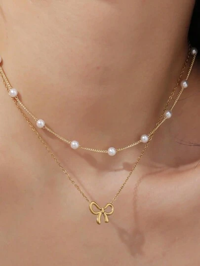 2 件金色仿珍珠项链和蝴蝶结项链多层项链女士金色蝴蝶结项链简约情人节 - 彩色 - 查看 1
