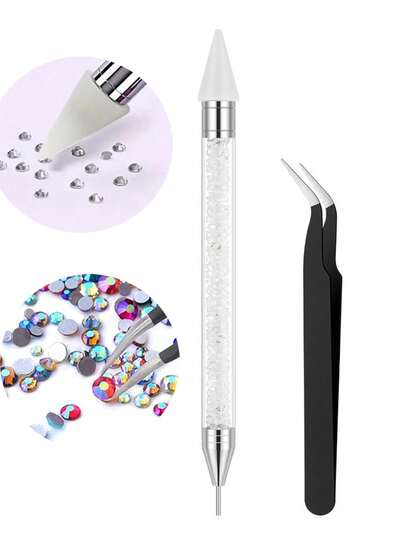2支装美甲双头水钻笔套装,含1支水钻涂抹工具 - 亚克力手柄双头蜡笔 DIY美甲工具,带镊子 - 彩色 - 查看 2
